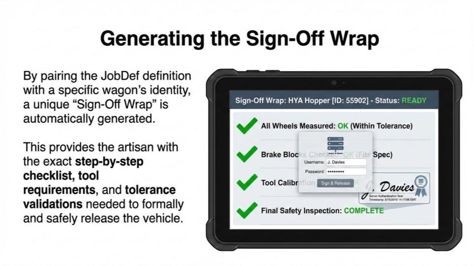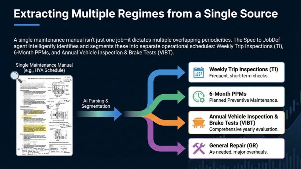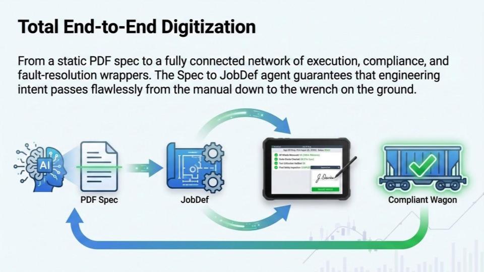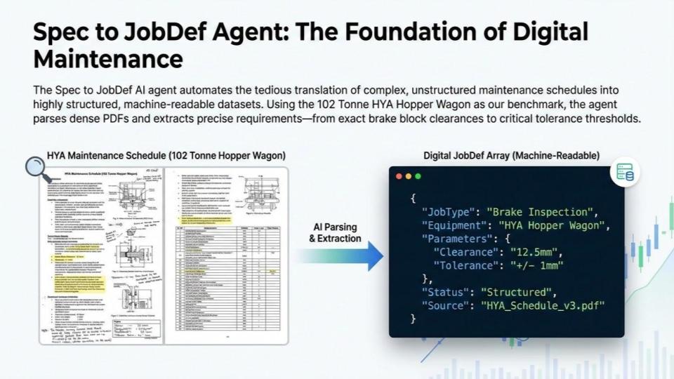 The Spec to JobDef AI agent automates the translation of complex, unstructured maintenance manuals (like PDFs) into highly structured, machine-readable datasets called "JobDefs." These JobDefs then act as the digital blueprint to drive step-by-step artisan execution, compliance tracking, and automated fault resolution within the ExcelWraps system.